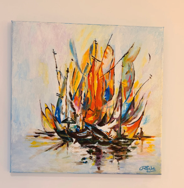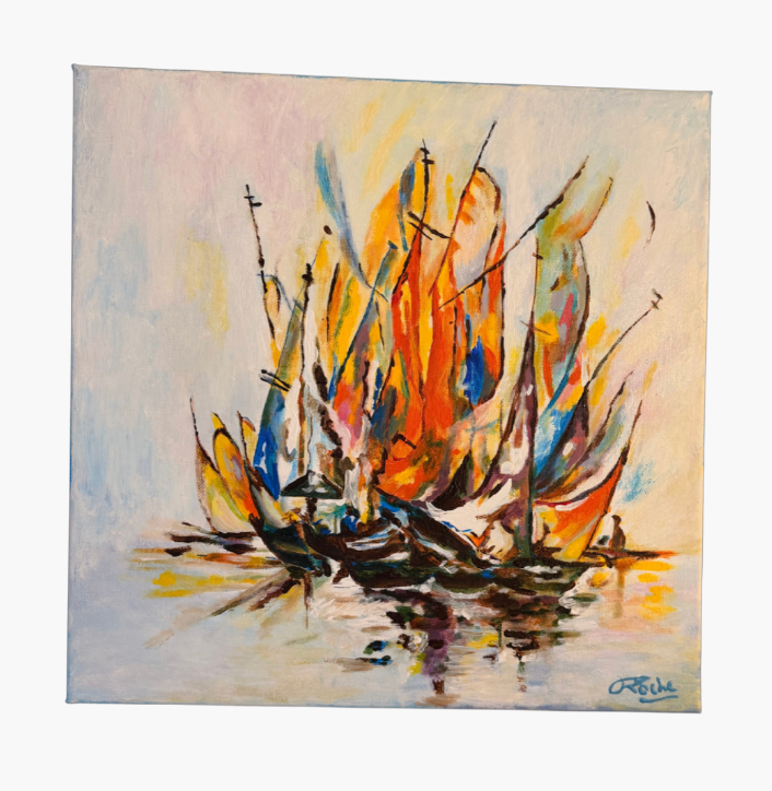 Dans “Ballet de Voiles”, J. Roche met en scène un groupe de bateaux dont les voiles s’élèvent comme des flammes multicolores. Les touches orangées, bleues, jaunes et rouges composent une danse lumineuse, presque abstraite, se reflétant délicatement sur une mer calme.