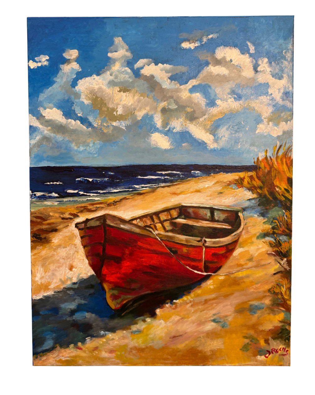 La maîtrise des nuances et la richesse de la matière acrylique traduisent tout le savoir-faire de l’artiste, sensible à la beauté des paysages naturels et à la douceur du littoral. Bateau échoué incarne ainsi l’esprit des œuvres de J. Roche : un dialogue entre la force des éléments et la quiétude du temps suspendu.