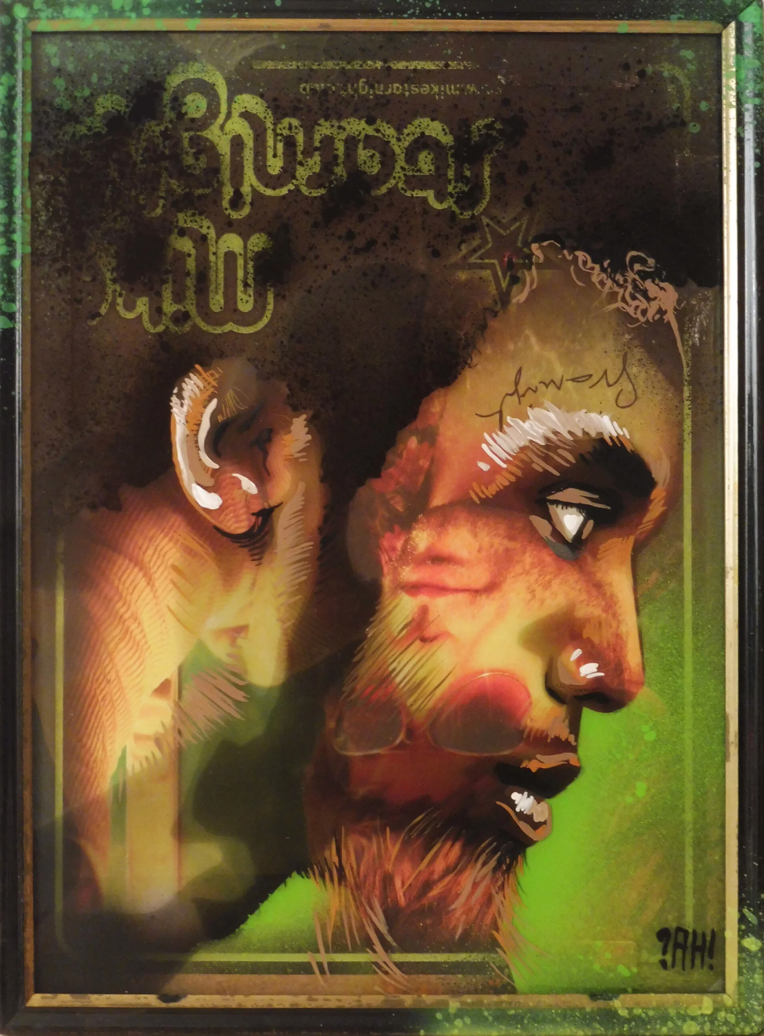Peinture sur verre superposée à une affiche encadrée, créant un effet 3D profond et lumineux. Une double silhouette travaillée par ?Ah!, mêlant textures, transparences et couleurs intenses. Une œuvre moderne, urbaine et expressive.