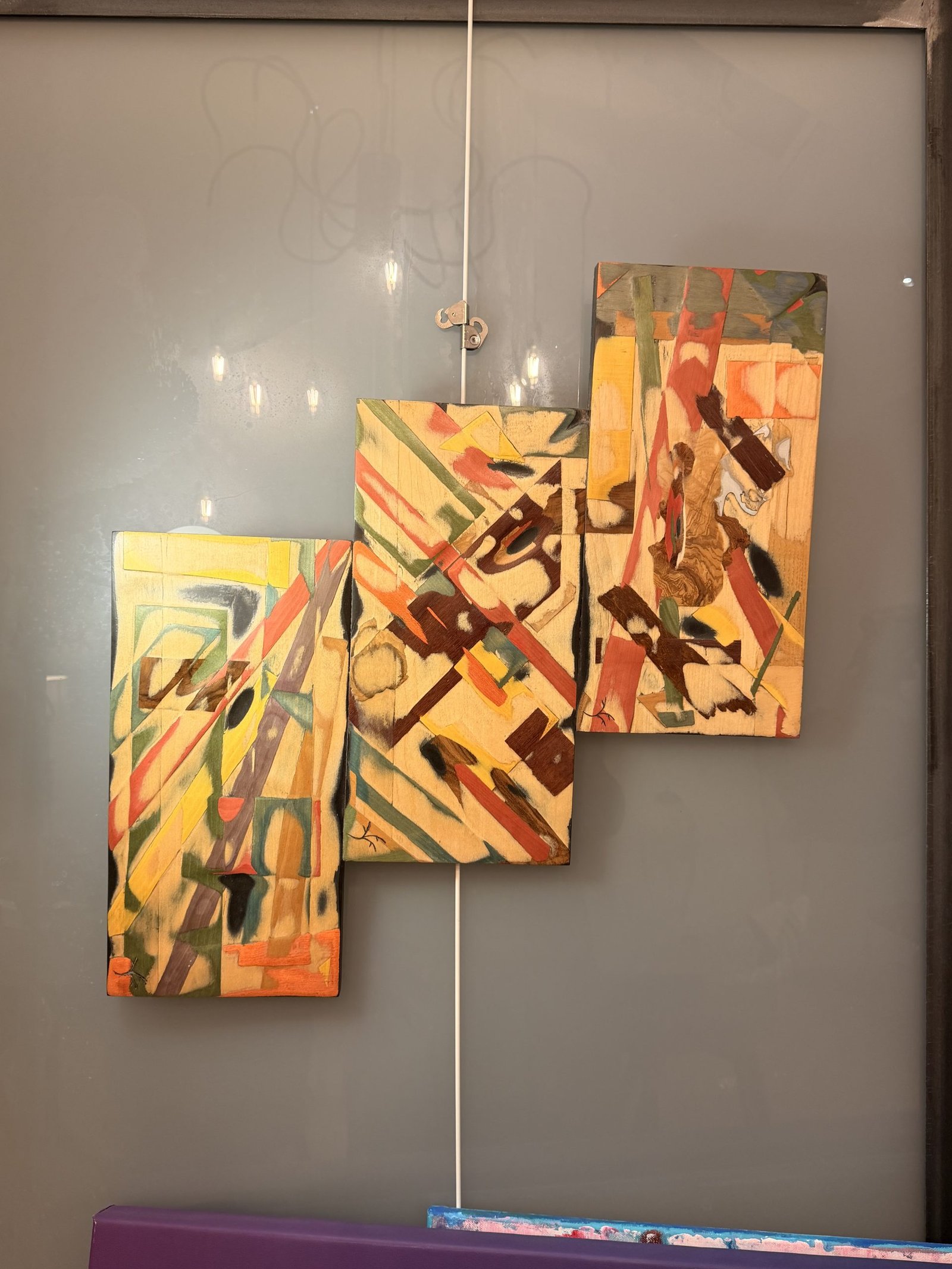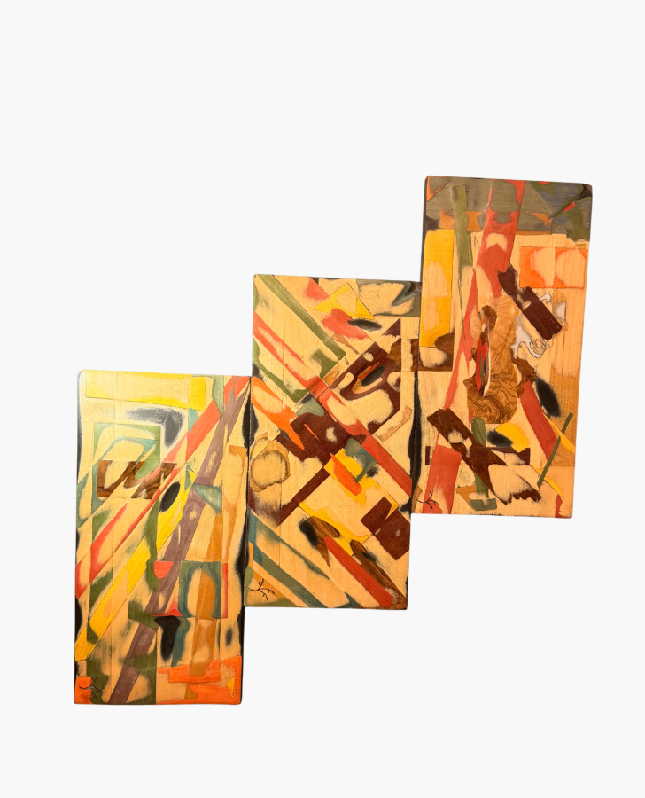 Cette pièce joue avec la géométrie, la couleur et les lignes pour composer une œuvre vivante, rythmée, presque musicale. Chaque panneau se répond, se complète et semble prolonger le mouvement des autres, comme si les trois fragments formaient une partition abstraite.