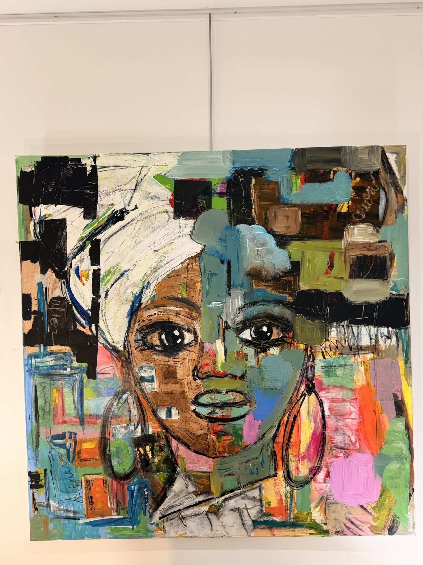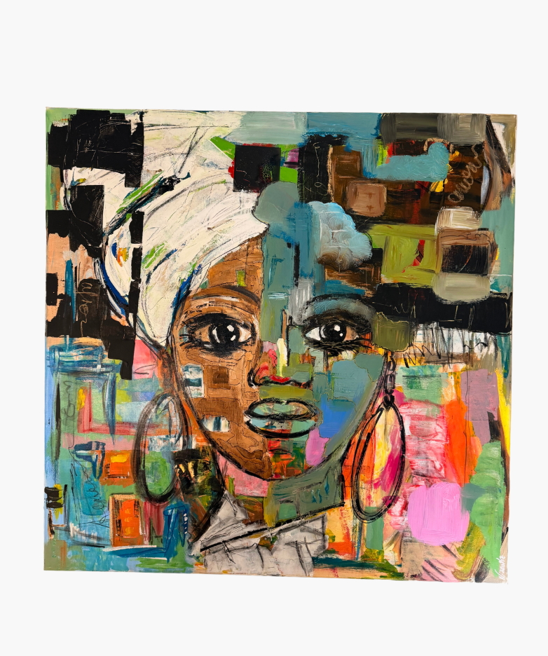 Ce grand format représente un visage féminin stylisé entouré d’un patchwork de couleurs. Le turban blanc, imposant, crée un contraste net avec la peau richement texturée du visage. Les larges boucles d’oreilles et les touches de rose, bleu, orange et noir apportent rythme et chaleur.
