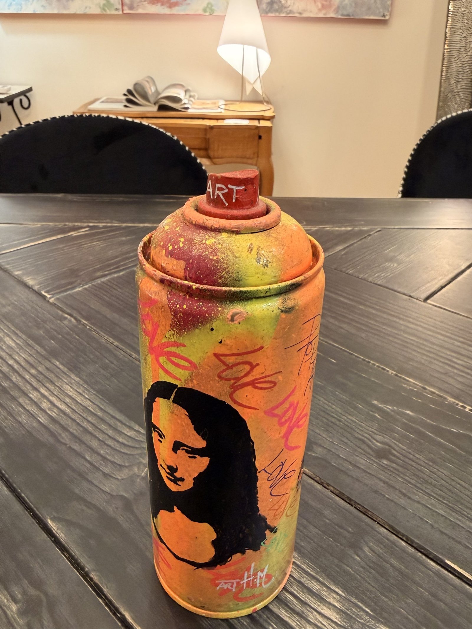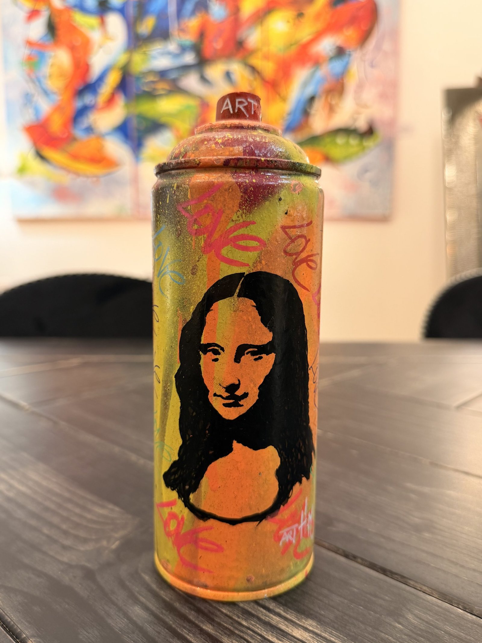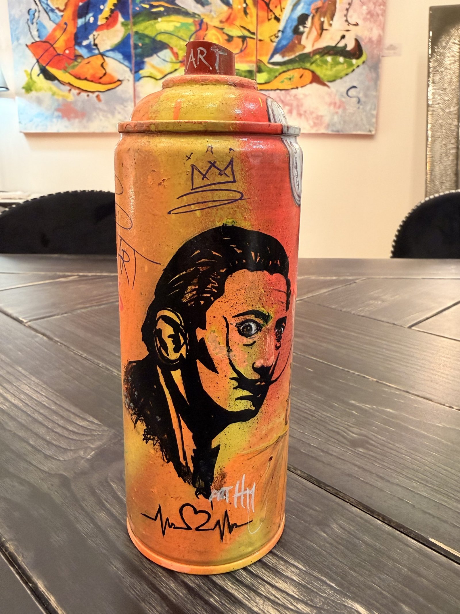 Bombe de peinture customisée en hommage à deux icônes de l’histoire de l’art : la Joconde et Salvador Dalí. Une pièce street-art vibrante, aux couleurs chaudes et éclatantes, mêlant modernité et héritage artistique.