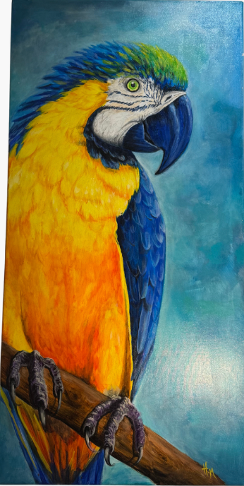 Ce tableau montre un ara bleu et jaune perché sur une branche, capturé avec un réalisme saisissant. Les plumes sont rendues avec minutie : le bleu profond des ailes contraste avec le jaune chaud du ventre, tandis que la tête présente des détails précis autour de l’œil et du bec.