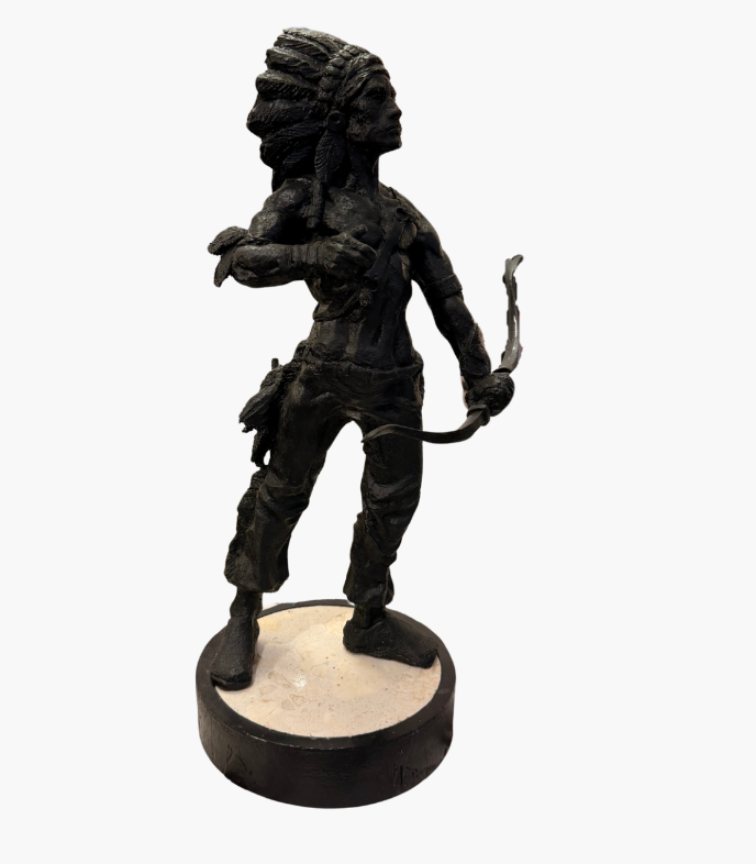 Cette pièce représente un guerrier amérindien, campé dans une posture déterminée, l’arc à la main et la tête légèrement tournée vers l’horizon. Sa coiffe traditionnelle, riche en détails, donne à l’œuvre une dimension symbolique et spirituelle.