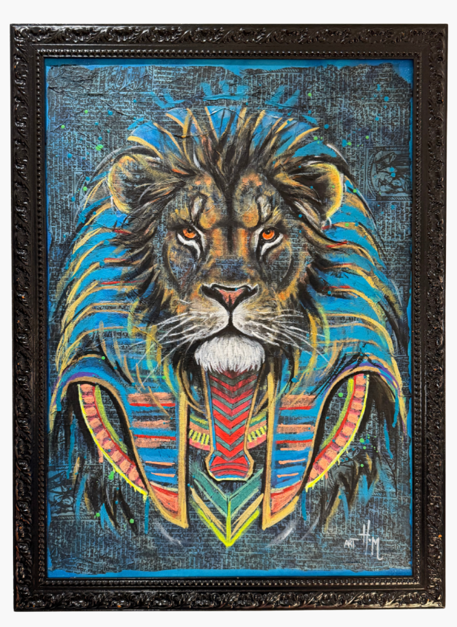 Cette œuvre représente un majestueux lion stylisé, fusionnant la puissance animale et l’imaginaire de l’Égypte ancienne. Le félin se dresse frontalement, le regard intense et perçant, presque humain, qui capte immédiatement l’attention. Sa crinière est magnifiée par des nuances bleues, jaunes et orangées, évoquant à la fois le feu, la lumière et le pouvoir solaire. Le lion porte une parure inspirée du némès des pharaons, richement détaillée avec des tons rouges et or.