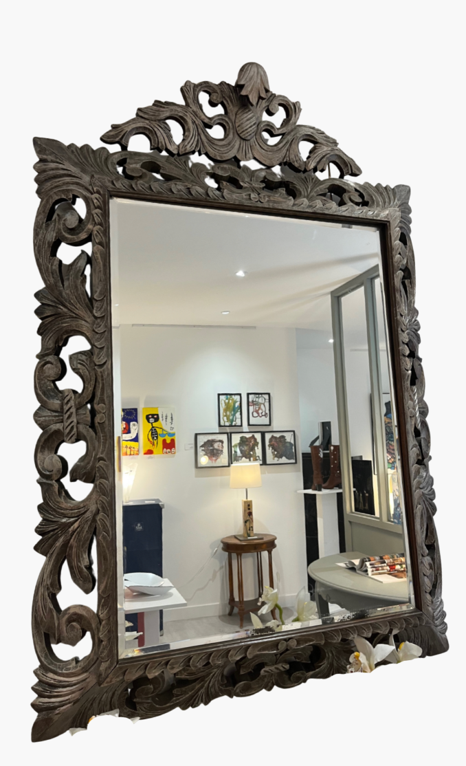 Ancien miroir des années 1930, restauré et relooké pour lui redonner tout son éclat. Le patinage légèrement vieilli met en valeur le relief des motifs et lui offre un style classique revisité, mêlant charme ancien et modernité.