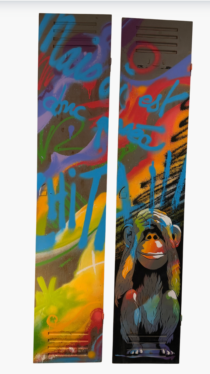 “Ne rien voir” est un diptyque signé Anne Henry, qui réinvente deux portes métalliques industrielles en véritables supports artistiques. L’artiste y déploie un univers coloré, urbain et percutant, mêlant graffiti, motifs spontanés et iconographie pop.