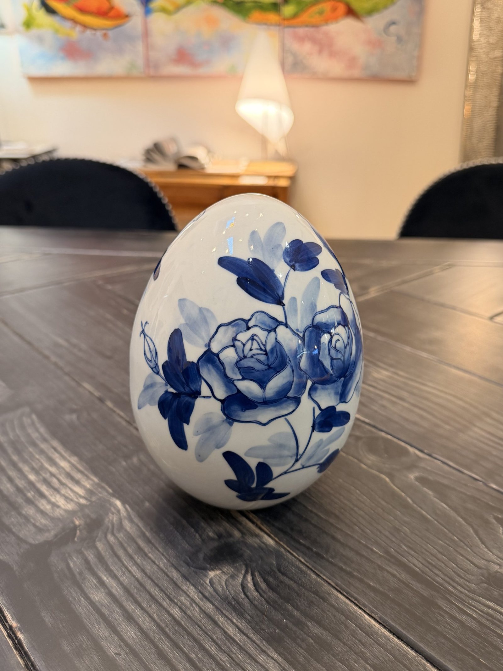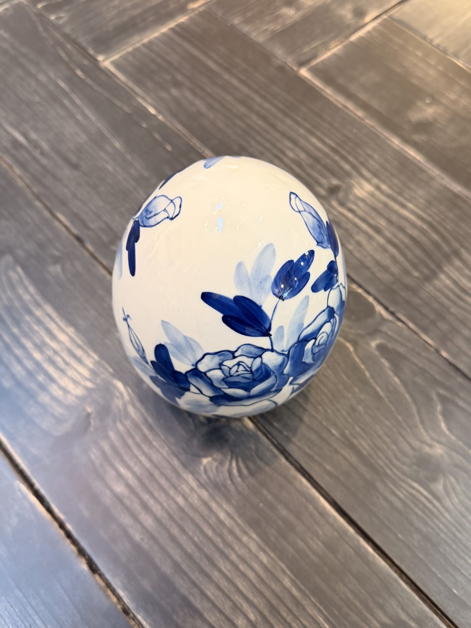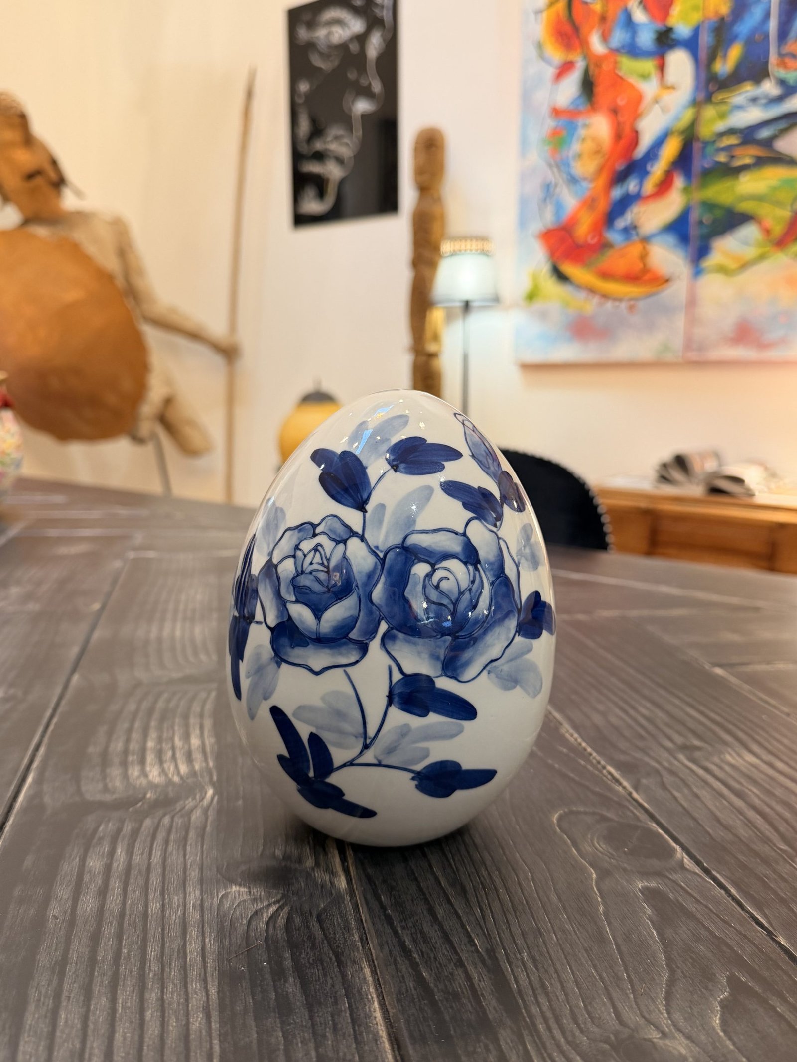 Œuf décoratif blanc peint en bleu, orné de roses élégantes. Une pièce raffinée et intemporelle, idéale pour apporter douceur et élégance à votre intérieur.