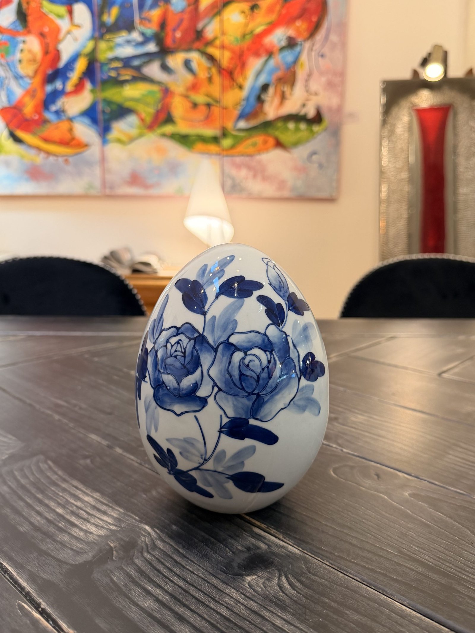 Ce magnifique œuf décoratif s’inspire des motifs floraux traditionnels, peints dans un dégradé de bleus d’une grande finesse. La surface blanche immaculée met en valeur les roses délicatement tracées, offrant un contraste doux et apaisant, idéal pour apporter une note élégante à n’importe quel intérieur.