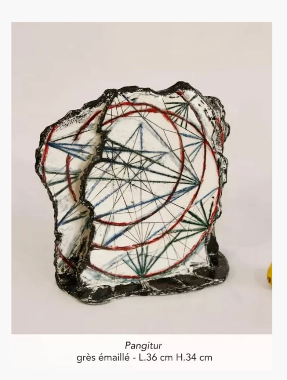 “Pangitur” est une œuvre en grès émaillé signée Luce Gaudin, céramiste connue pour ses créations mêlant géométrie, poésie et matière brute.