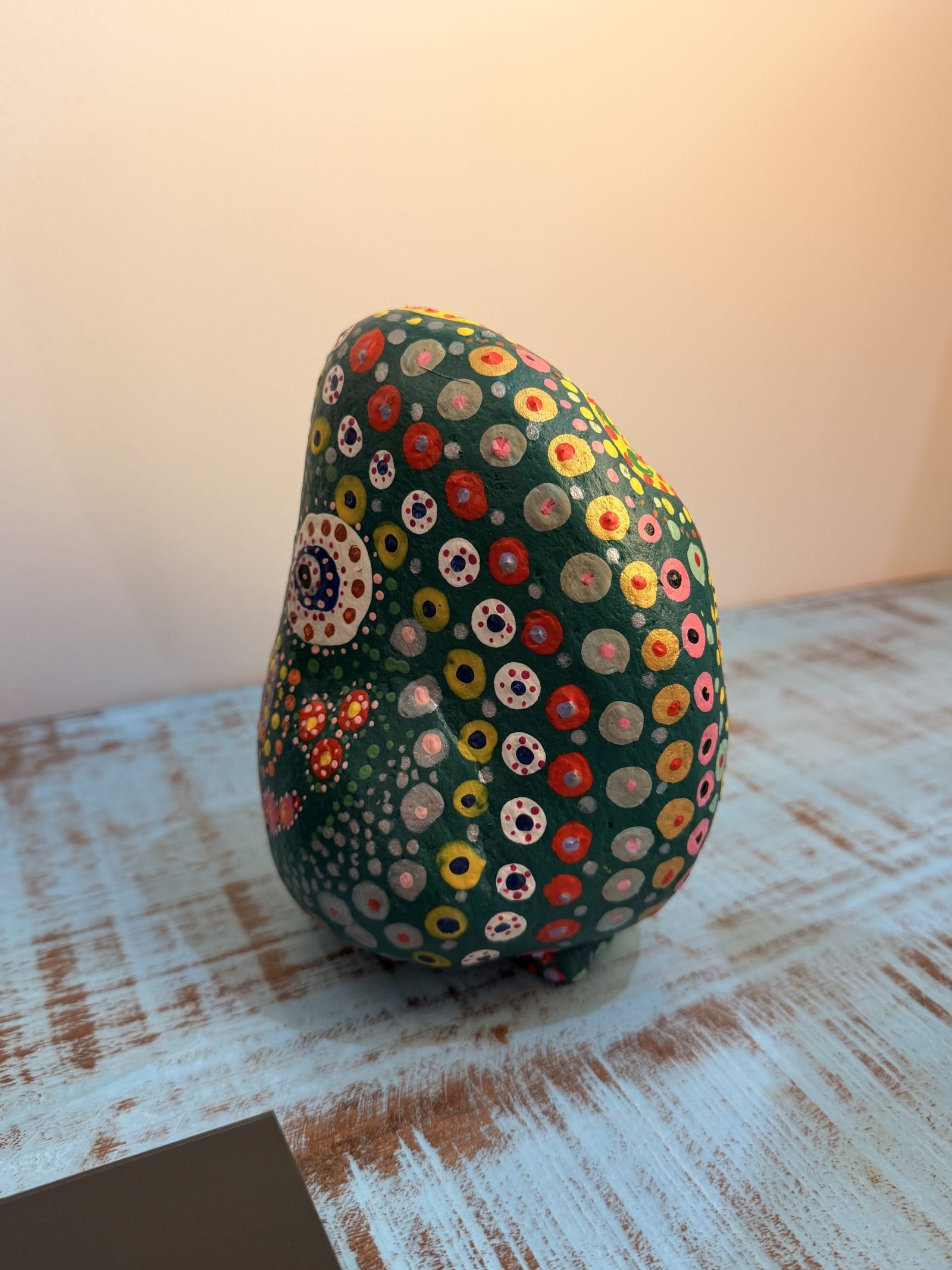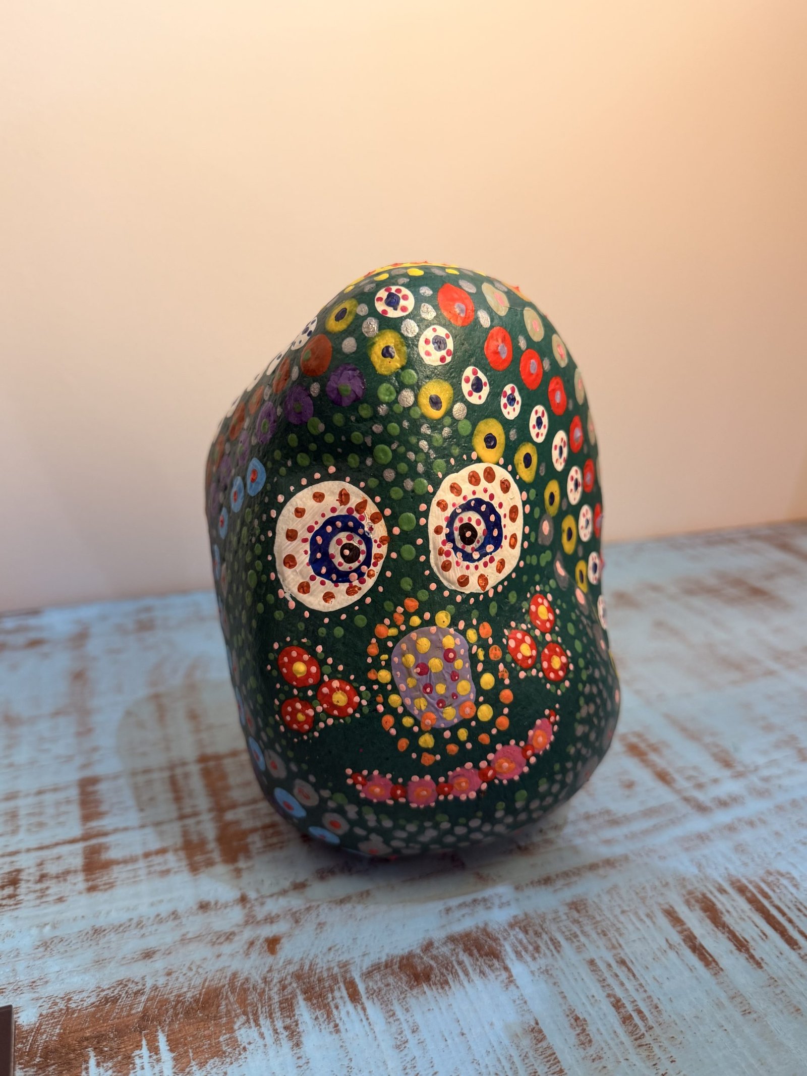 Pierre peinte à la main création colorée et ludique de Kremer Innovation. Motifs en pointillés, visage stylisé et pièce unique pleine de personnalité.