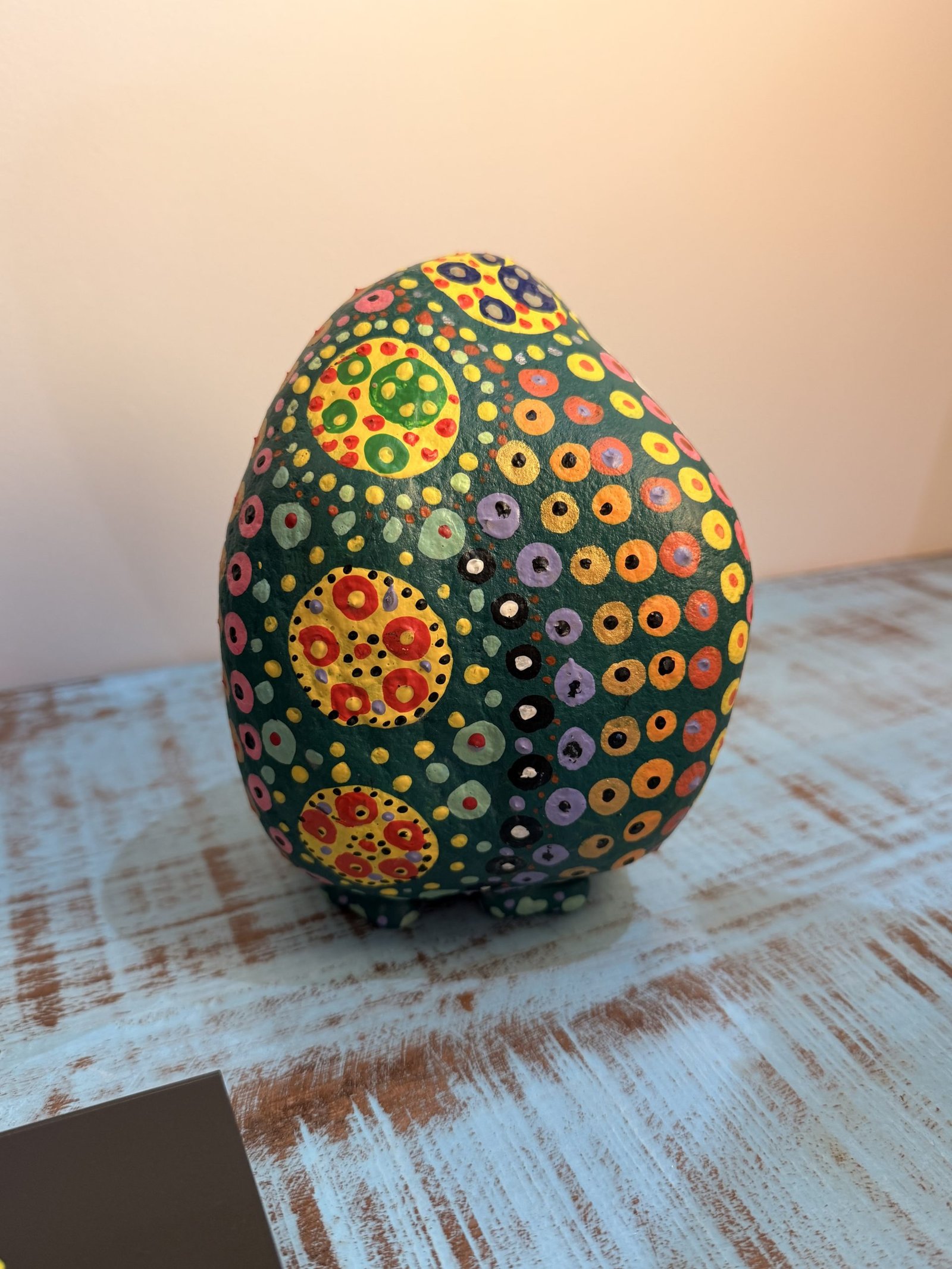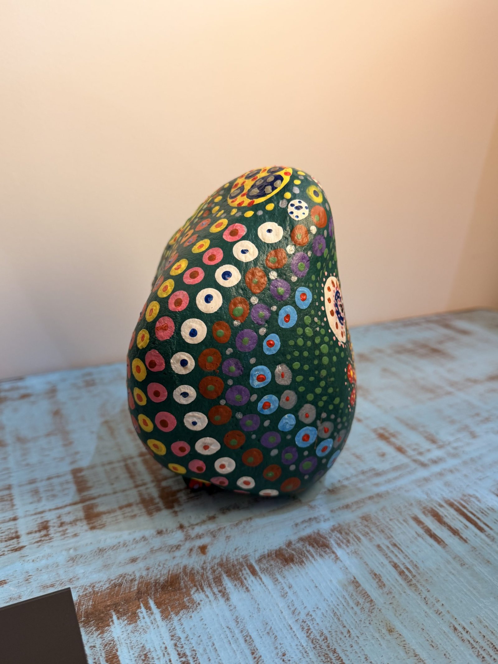 Cette création originale de Kremer Innovation transforme une simple pierre en une véritable œuvre d’art ludique et vibrante. Entièrement peinte à la main, elle est recouverte d’une multitude de motifs colorés en pointillés, inspirés des techniques décoratives aborigènes et du style pop-art.