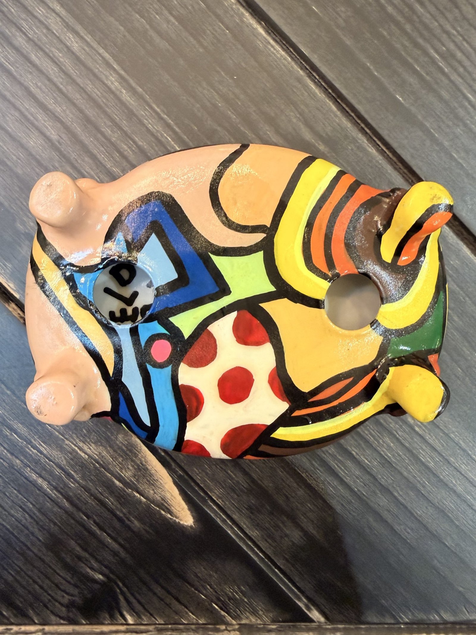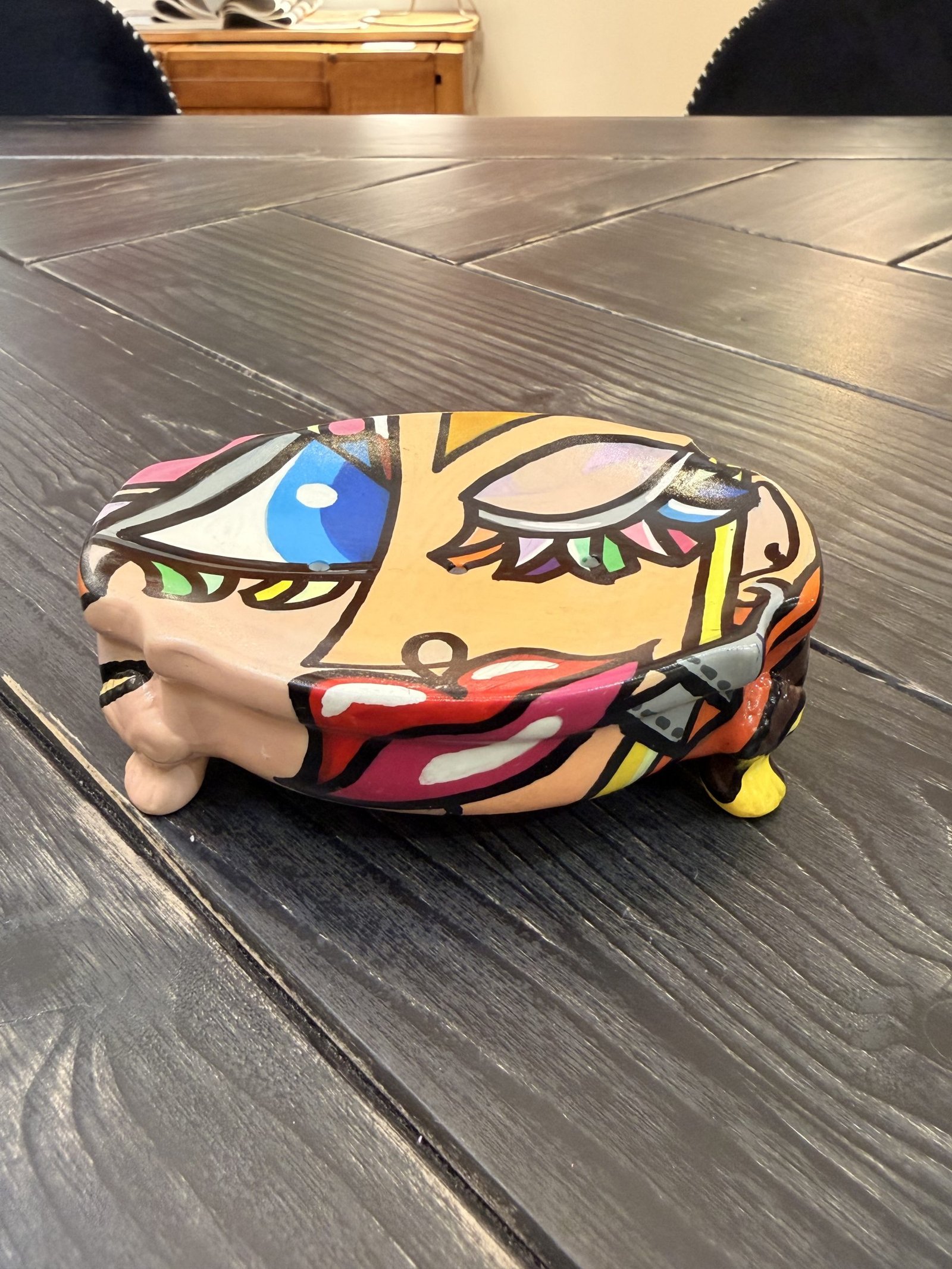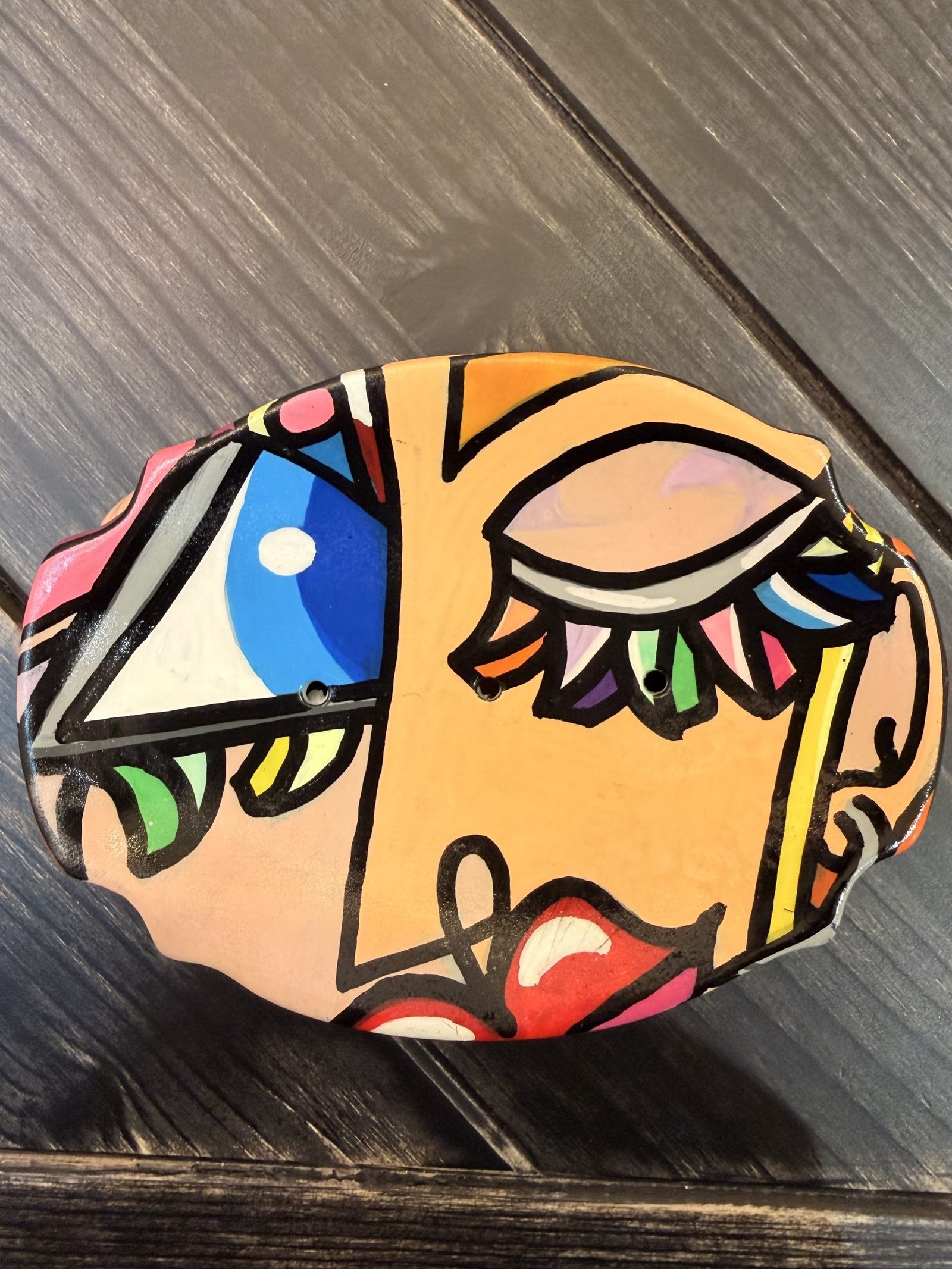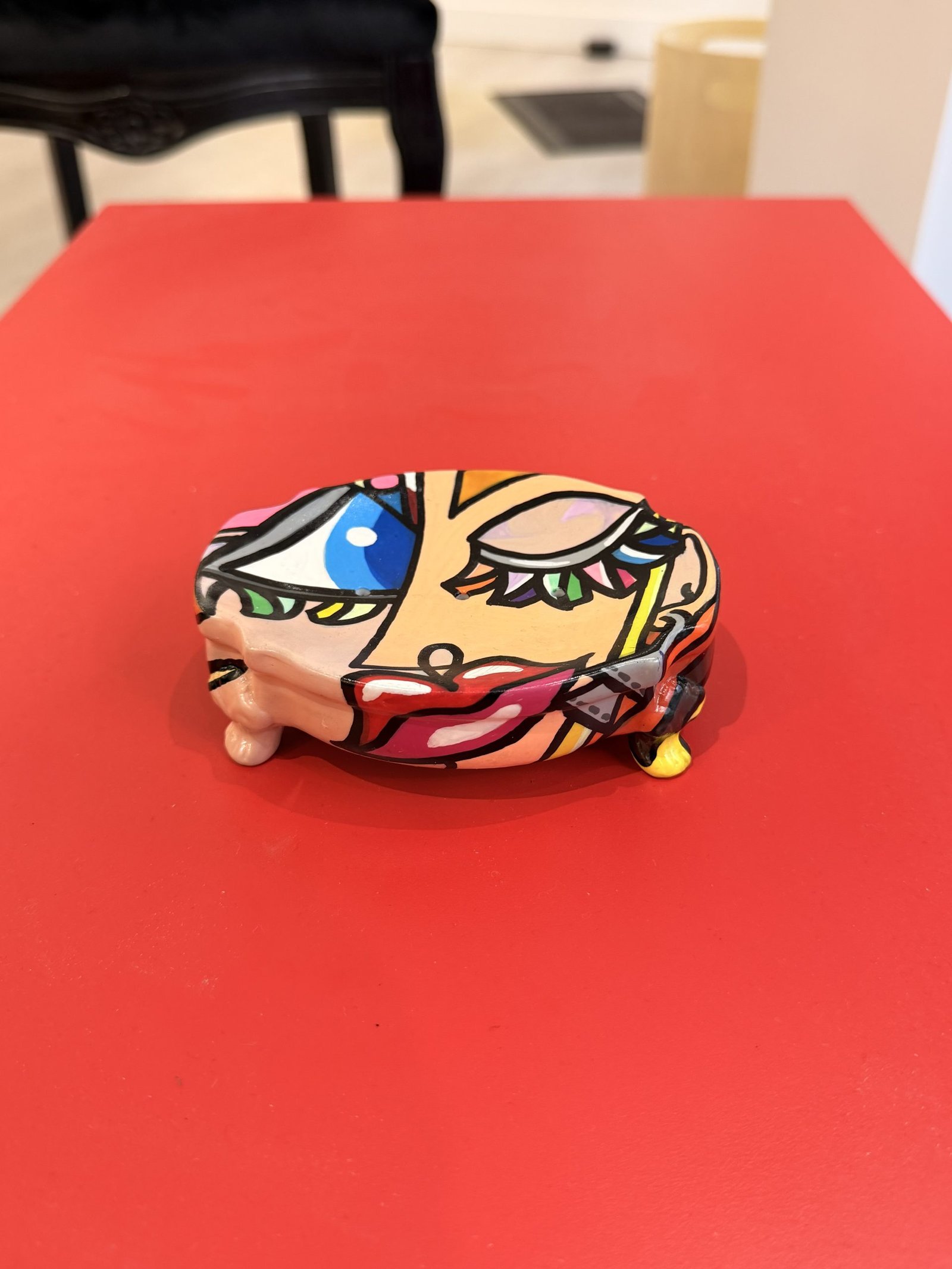 Ce porte-savon est une pièce d’art singulière, entièrement peinte à la main par l’artiste contemporaine Selda. Avec son style pop-art reconnaissable, l’objet se transforme en véritable élément décoratif grâce à ses couleurs vibrantes, ses lignes noires affirmées et ses motifs inspirés du monde graphique et urbain.