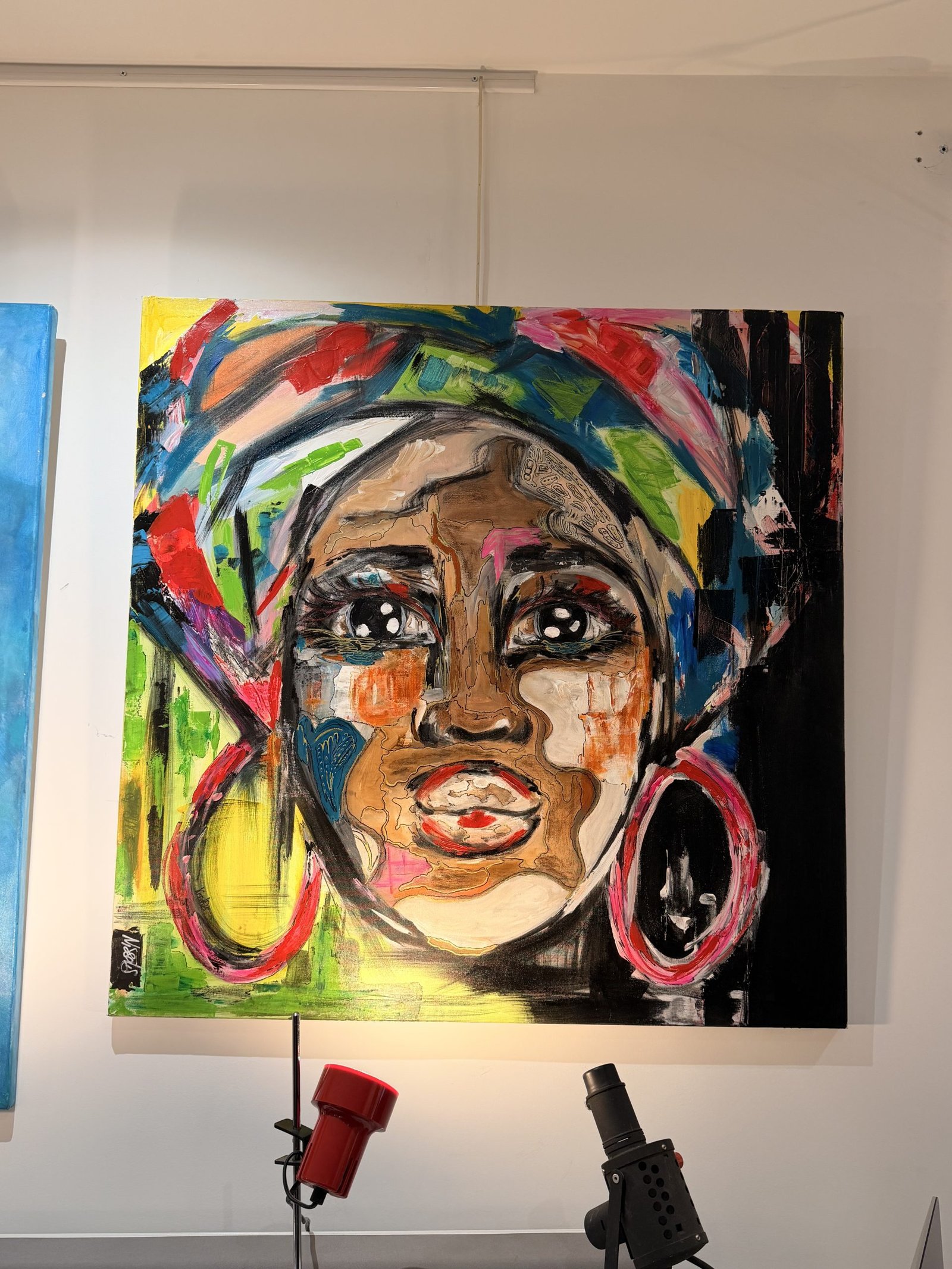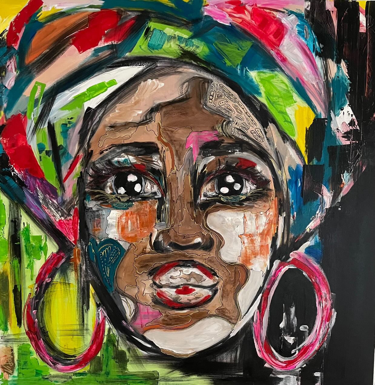 La matière est épaisse, les coups de pinceaux visibles, presque impulsifs. Les motifs abstraits se mêlent aux détails figuratifs, brouillant les frontières entre portrait et abstraction. On y ressent à la fois énergie, liberté et profondeur intérieure.