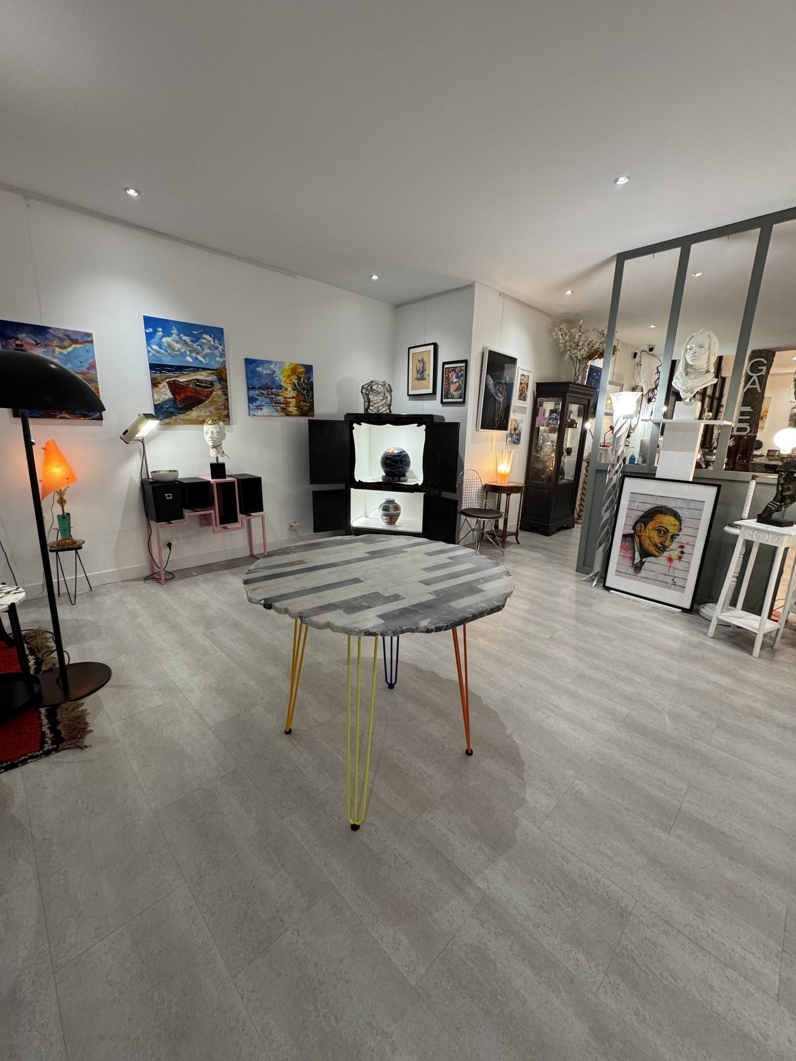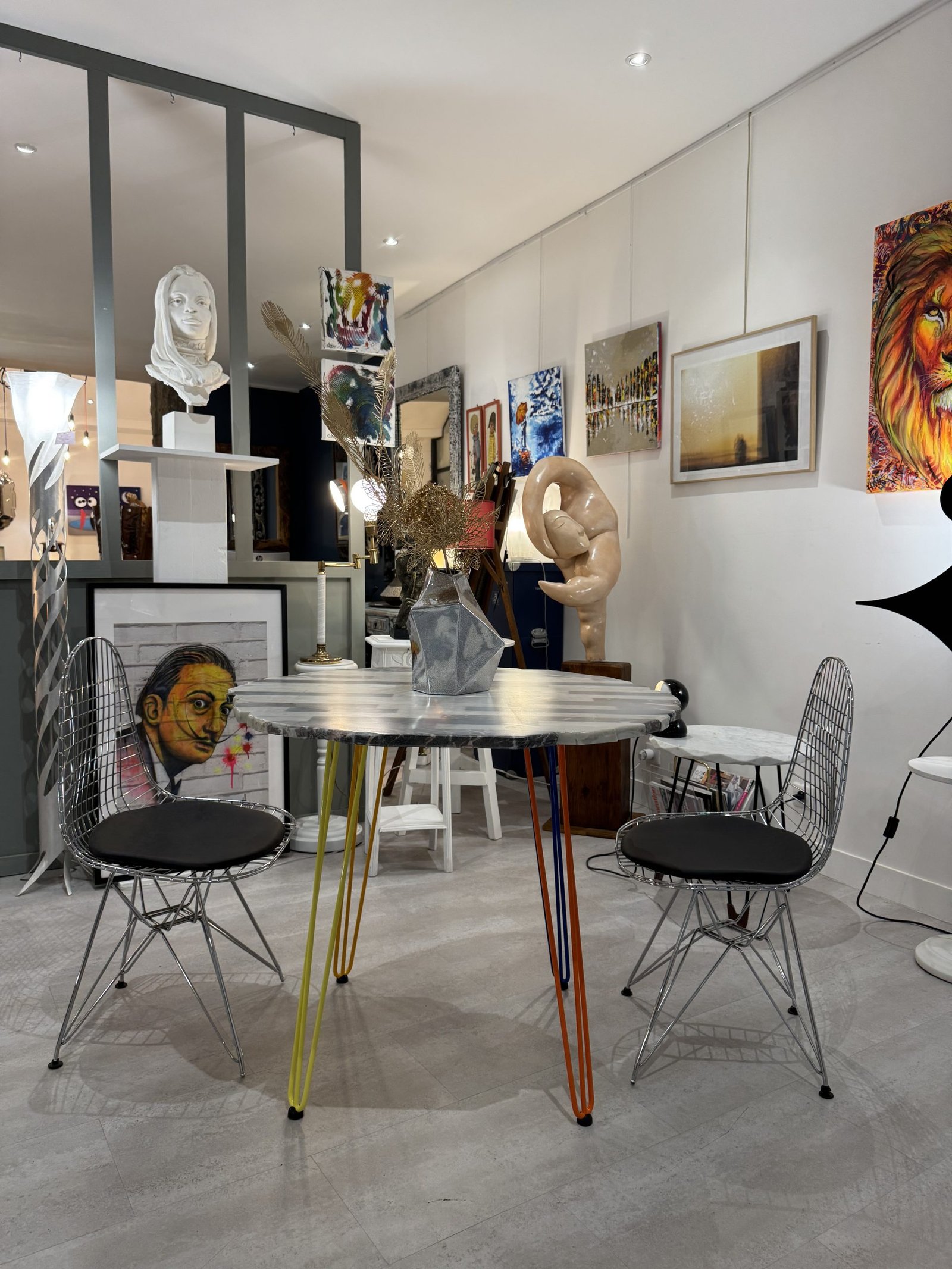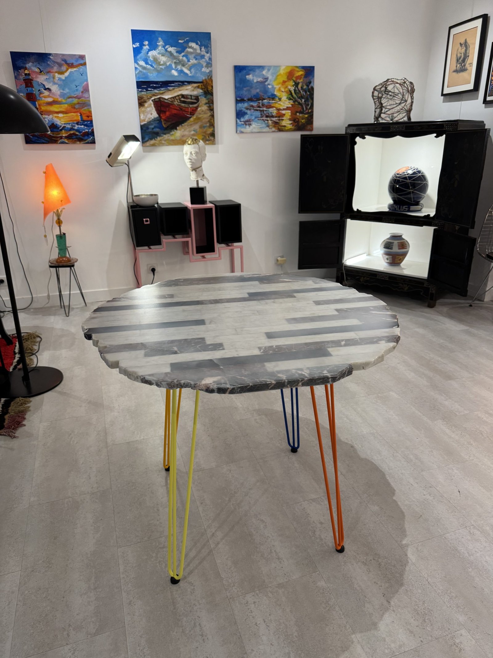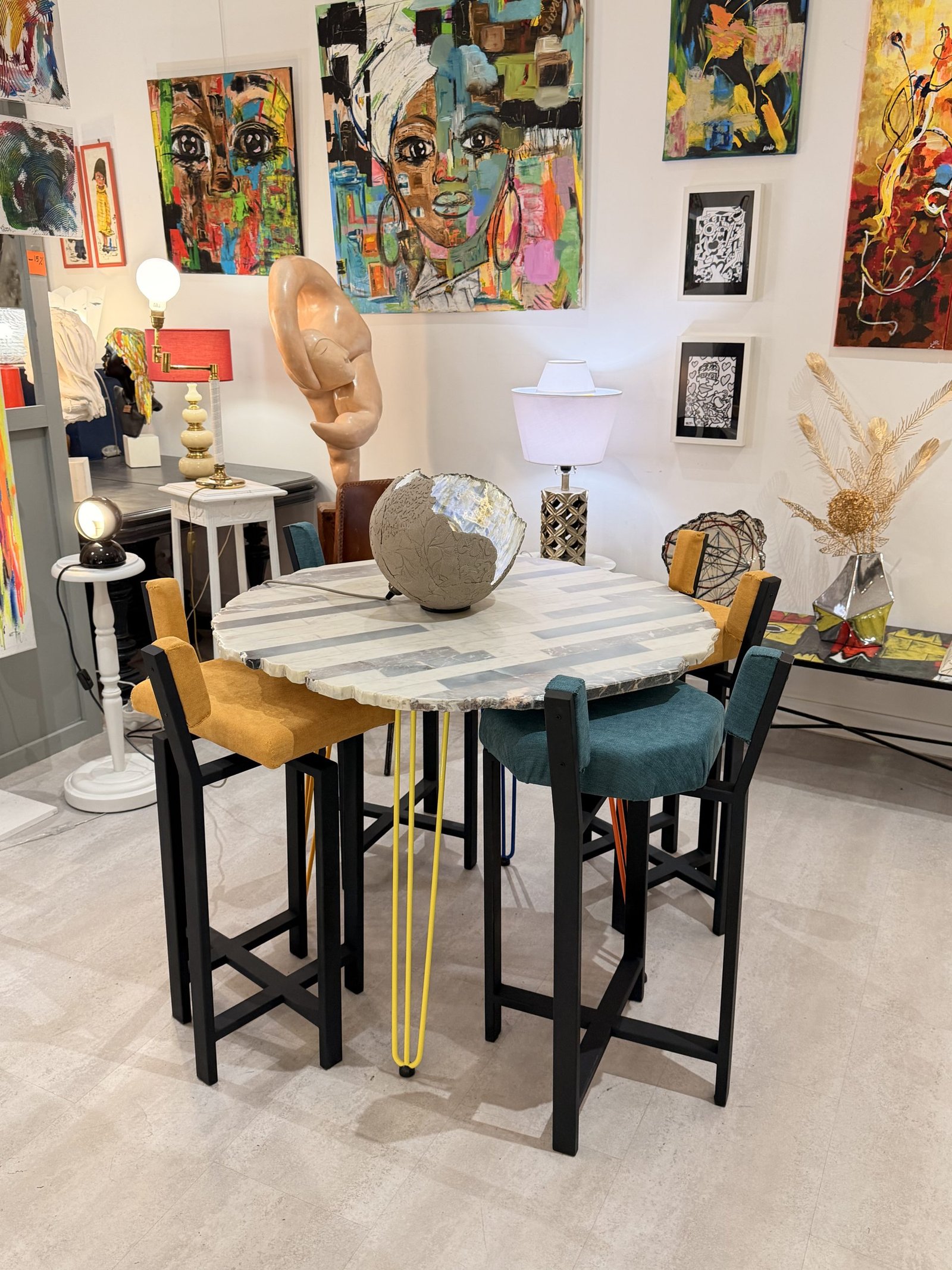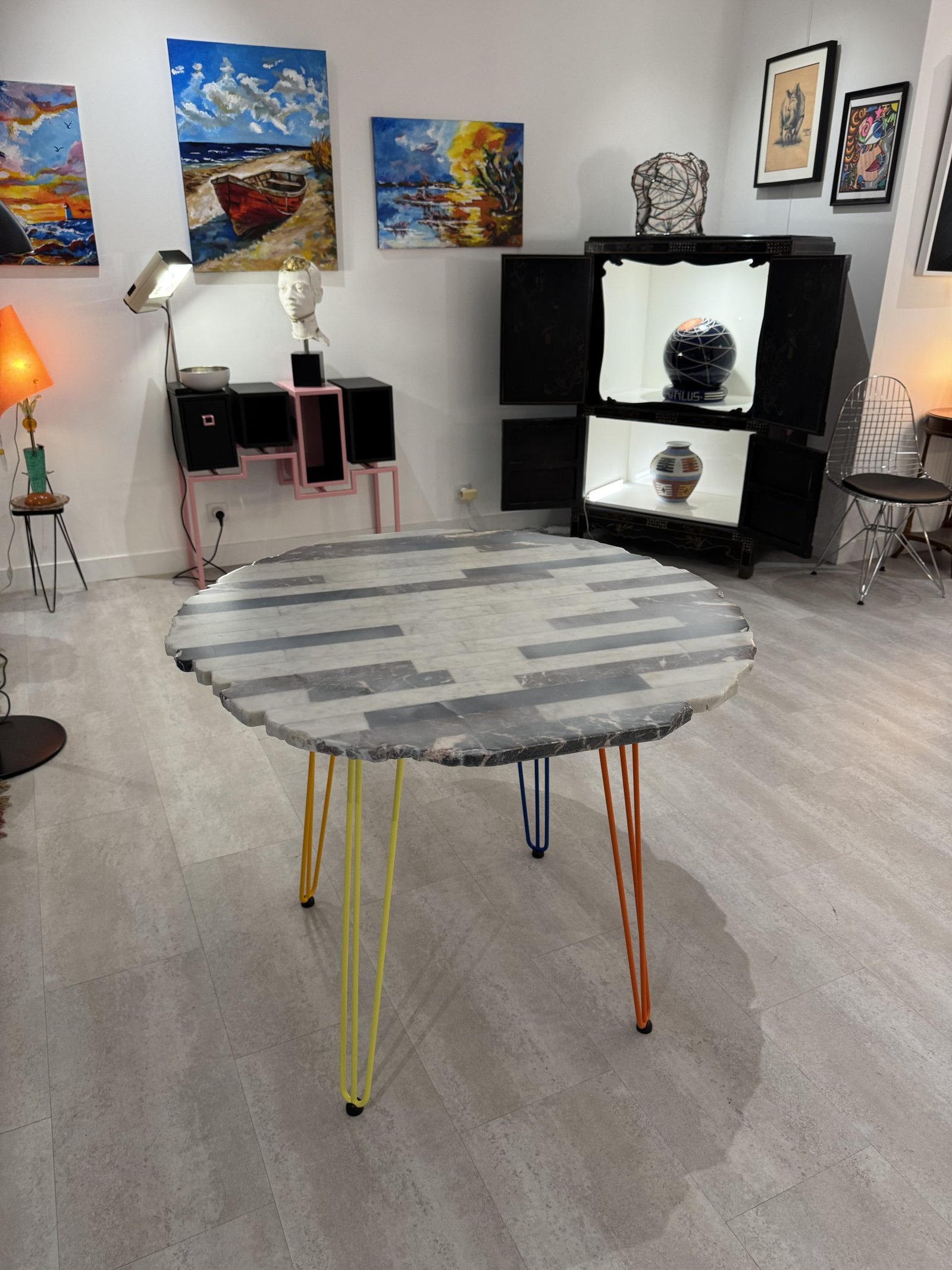 Après un long travail de ponçage, de reconstruction et de mise en valeur, ce marbre renaît sous la forme d’une table artistique, contemporaine et durable.