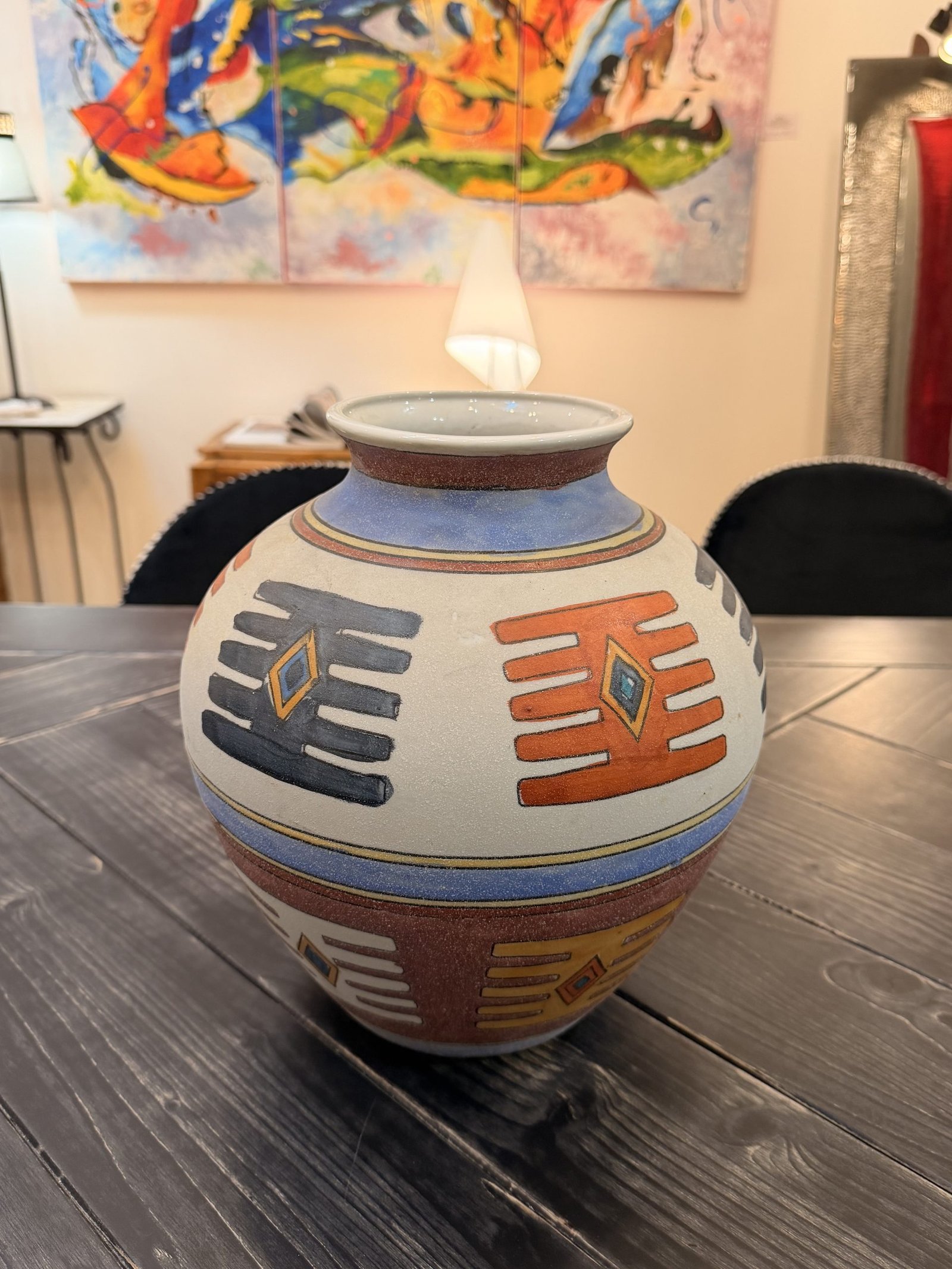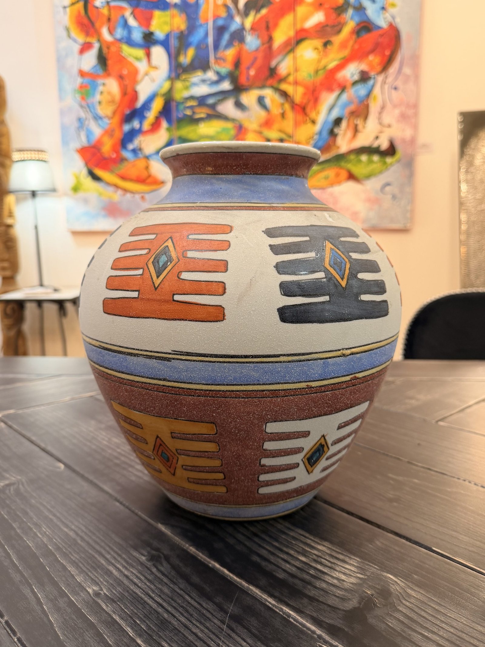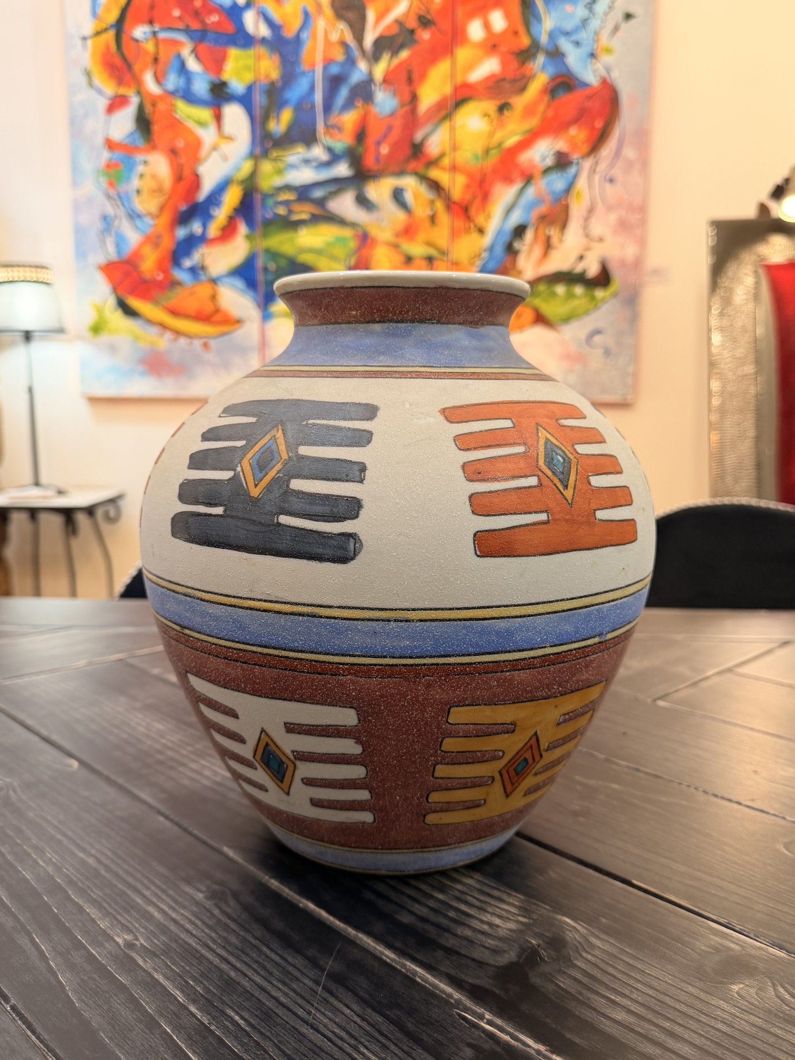 Les motifs géométriques, peints dans des teintes profondes bleu minéral, ocre, rouge terre et noir témoignent d’un travail minutieux et d’une harmonie chromatique rare. Chaque symbole stylisé évoque un langage visuel inspiré des arts ethniques et tribaux, donnant au vase une forte présence décorative.